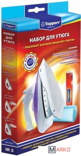 Комплектация - защитная насадка для утюга;- чистящий карандаш;- специальная салфетка.